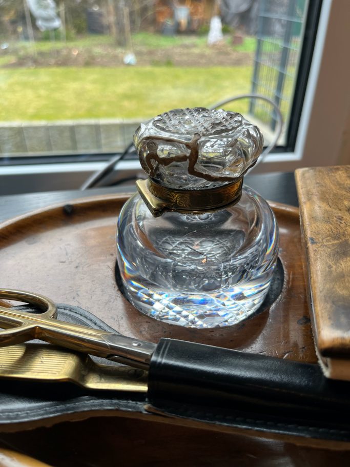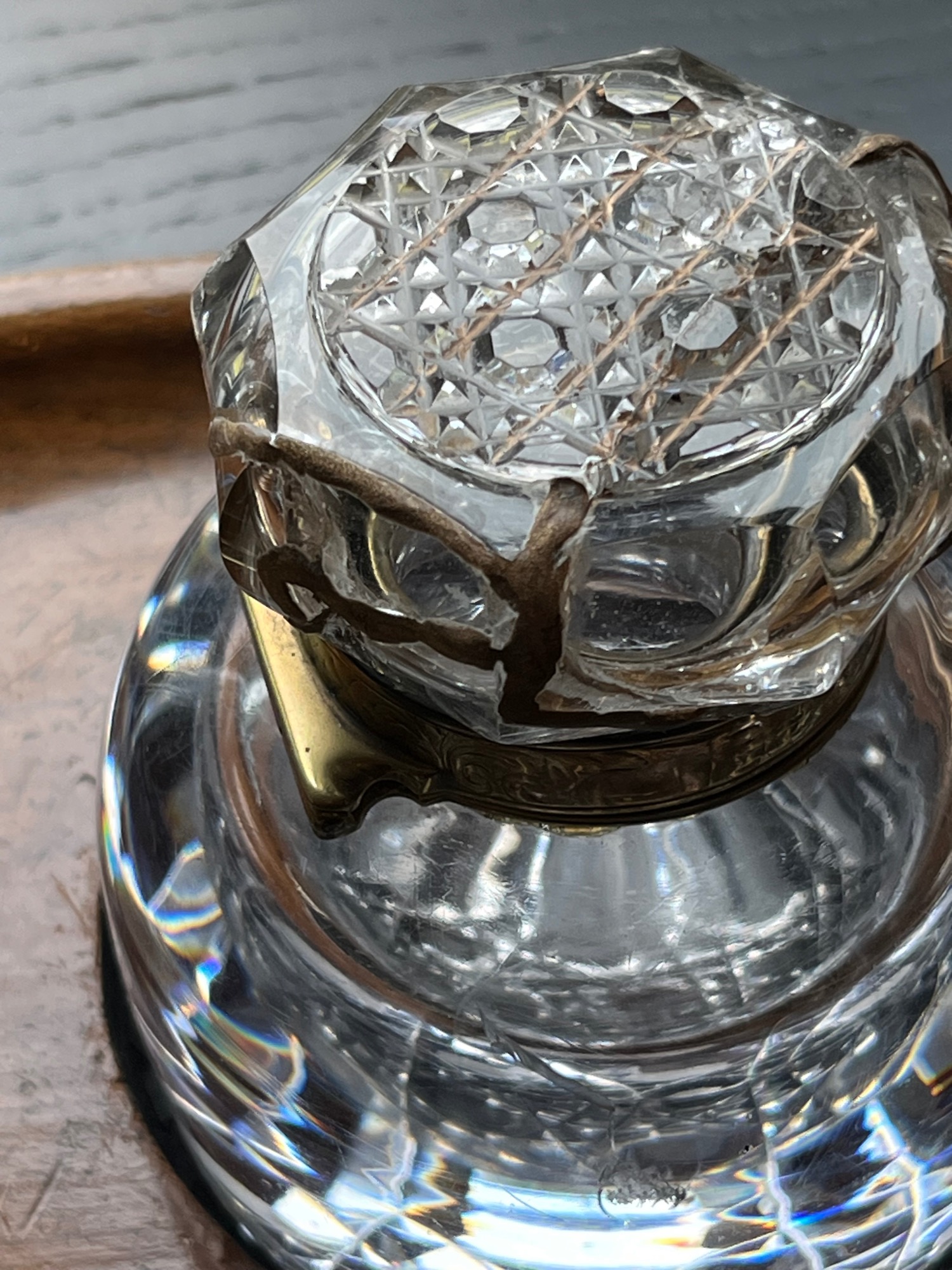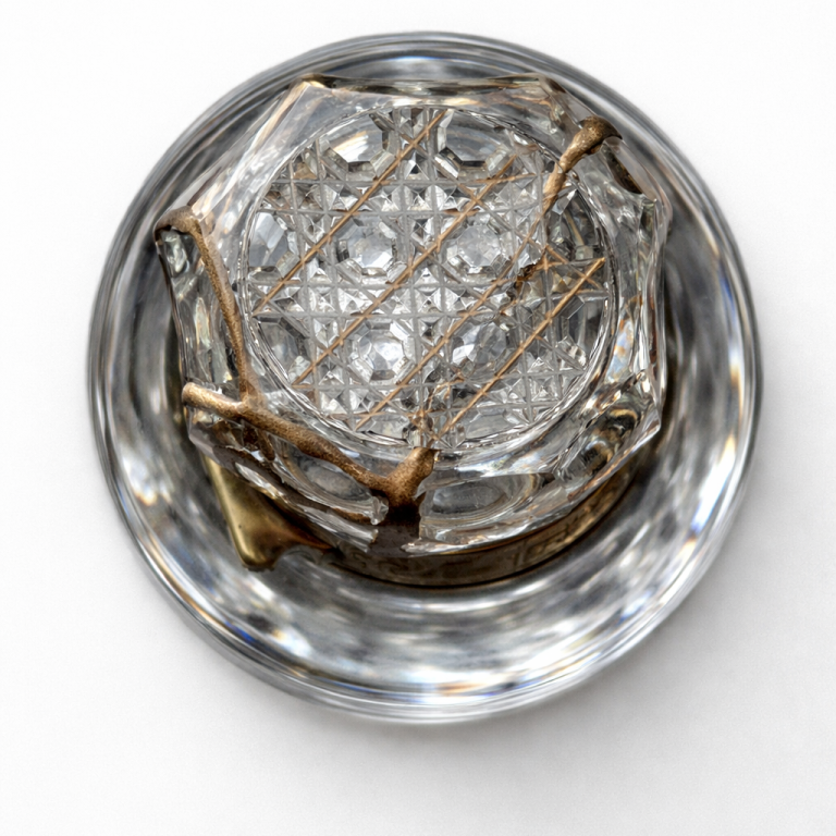 Die feinen Bruchlinien durchziehen das Kristall wie ein neues Ornament. Gold verbindet die Fragmente und verleiht der klaren Form eine unerwartete Tiefe. Aus Zerbrechlichkeit entsteht Präzision und neue Präsenz.