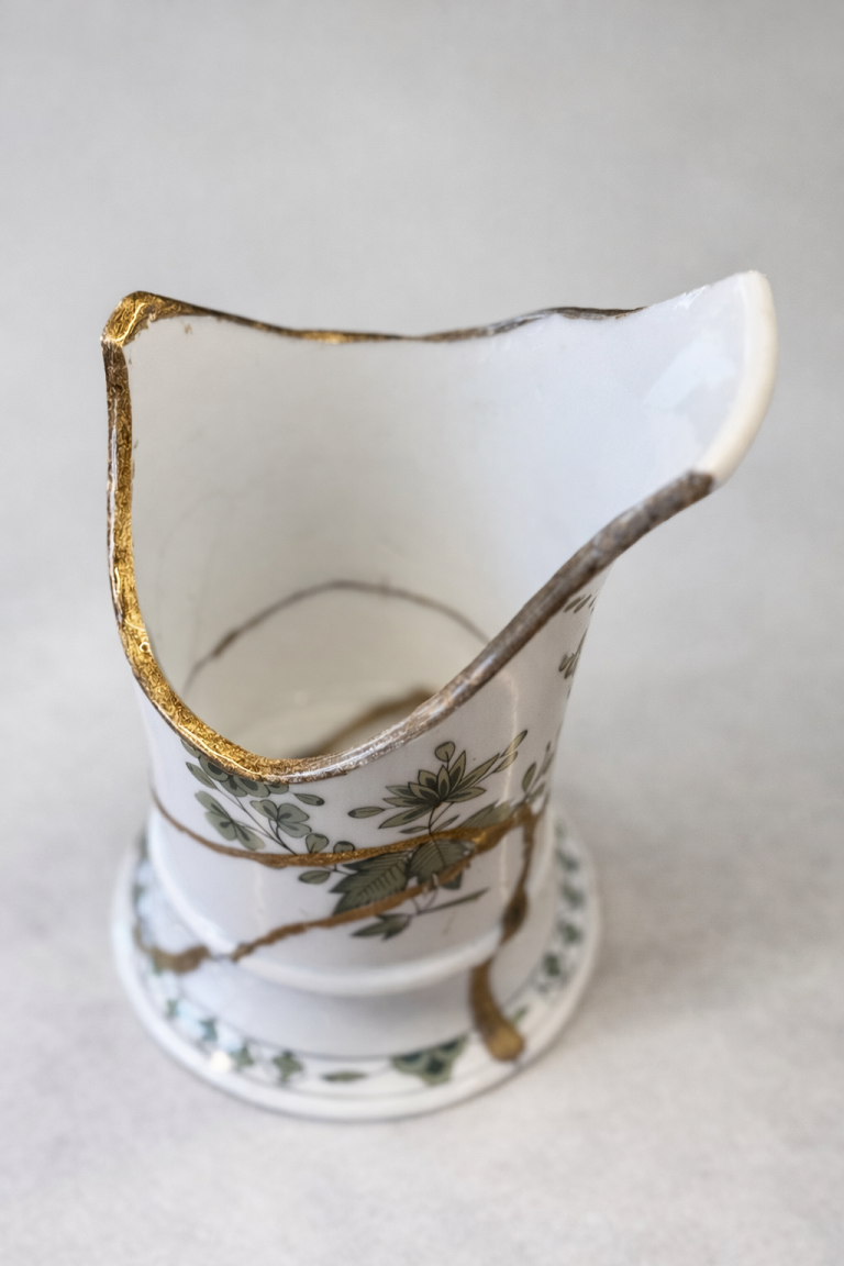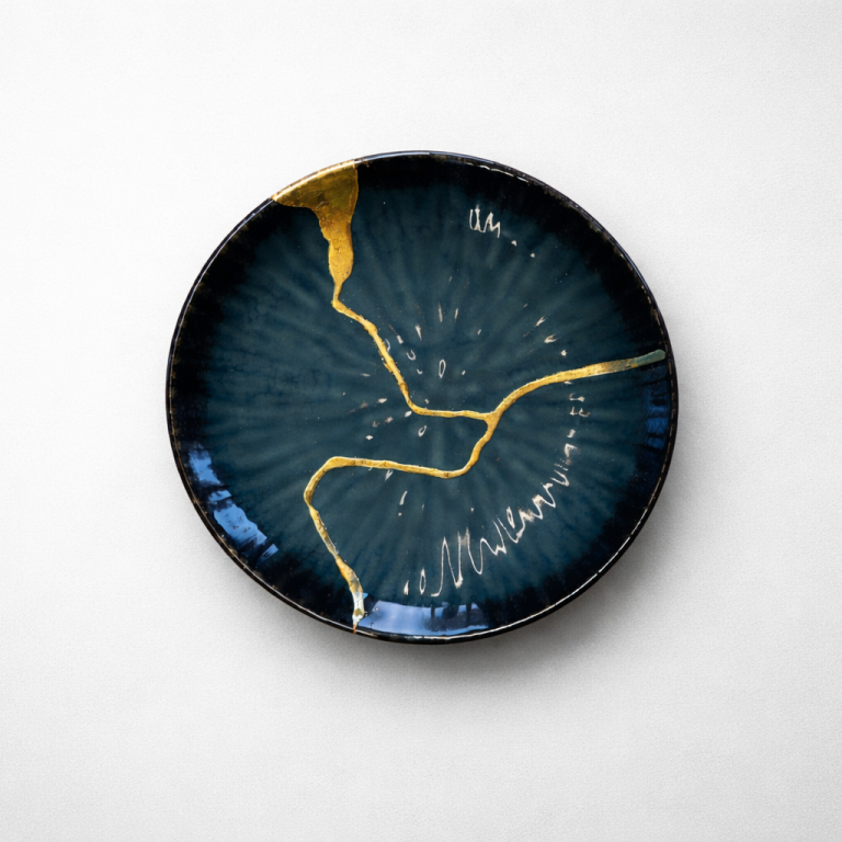 Gold hebt die Bruchlinien hervor und verleiht dem Objekt neue Würde. Aus dem Zerbrochenen entsteht etwas Wertvolleres. Reparatur wird zur bewussten Veredelung.